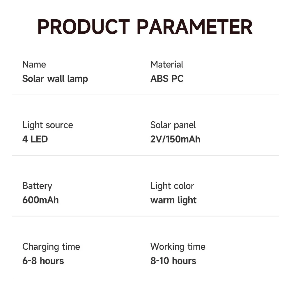 • 4 مصابيح ليد :مع 4 مصابيح ليد ، يوفر مصباح الجدار الشمسي إضاءة مشرقة وفعالة للمساحة الخارجية الخاصة بك.